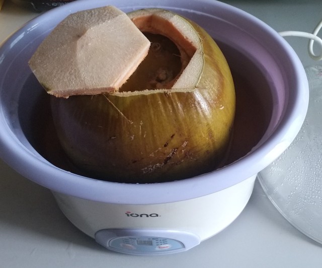 Double boil the entire coconut shell for one and half hour to two hours depending on the size of the coconut.