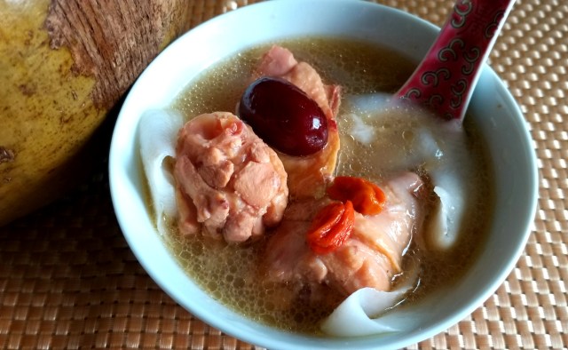 Add the chicken pieces, sliced ginger and wolfberries into the coconut shell.