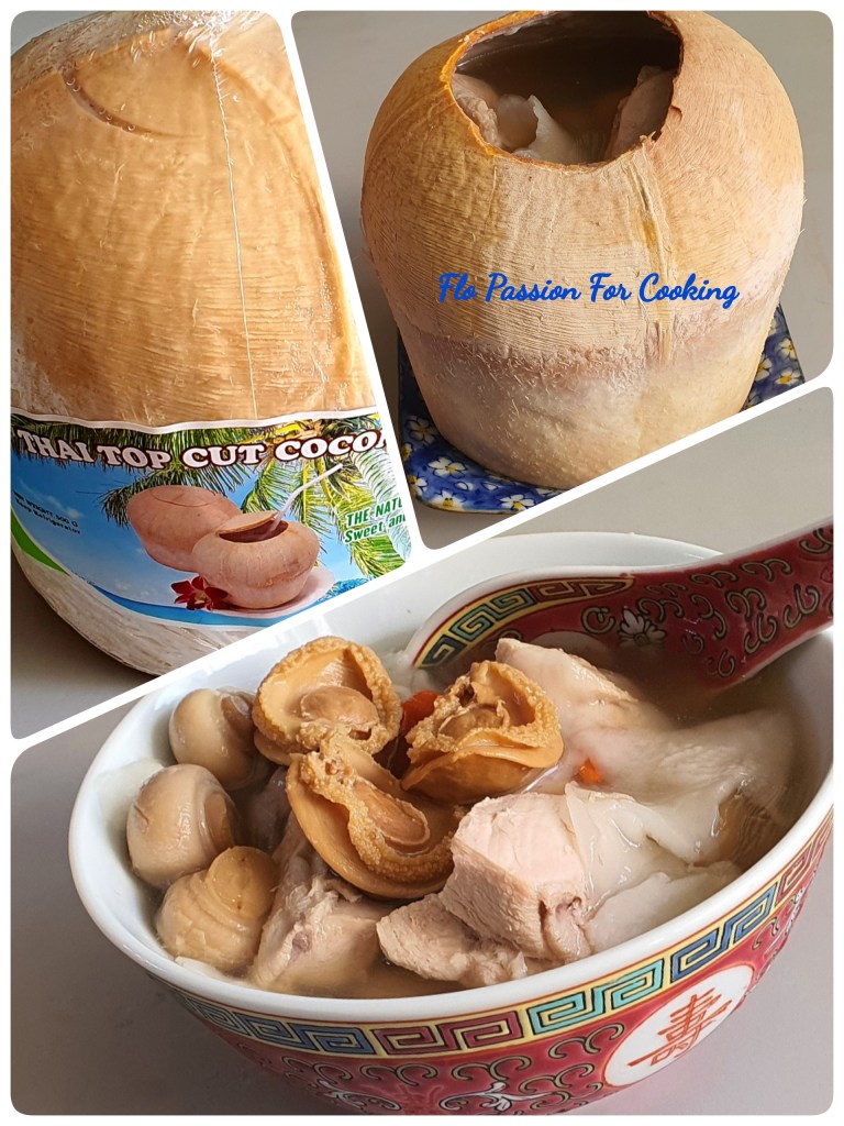 Now add the chicken stock into the coconut shell giving some allowance for the coconut juice.