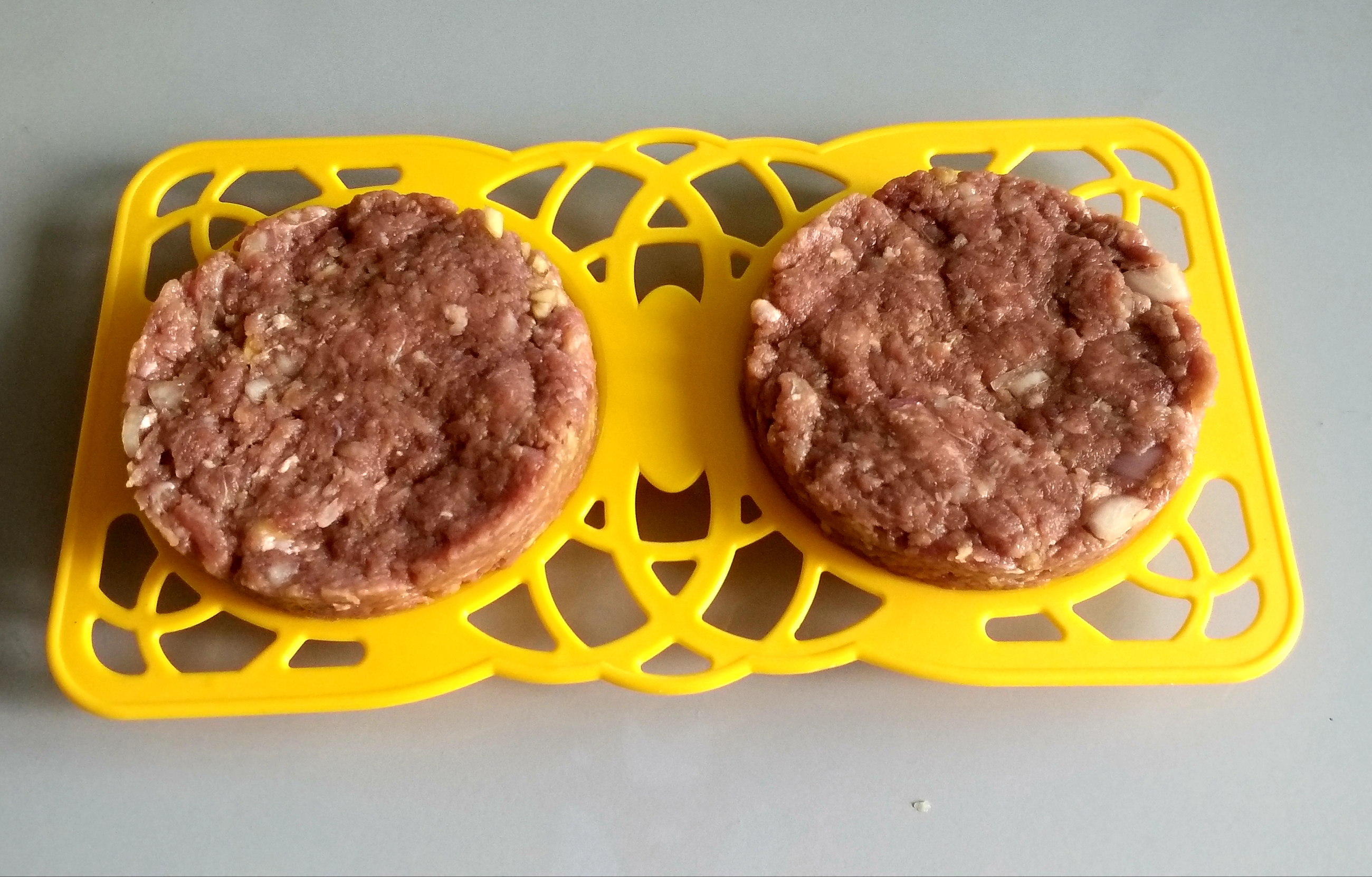 Add sufficient meat and lightly pressed into the mould ensuring the meat holds together in the burger press.