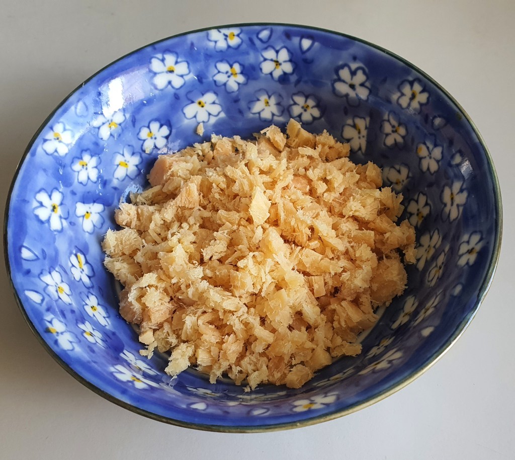 In a mixing bowl, add the minced pork, diced waterchestnut (4 to 5 pieces), panfried salted fish, chopped thumb sized young ginger, cornflour dash of white pepper and 2 tablespoon of water. Mixed well.