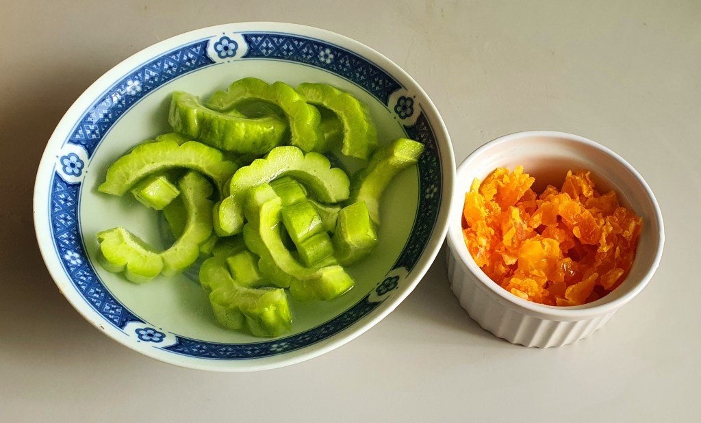 Halved the Bitter Gourd lengthwise and use a metal spoon to remove the seeds and slice thinly.