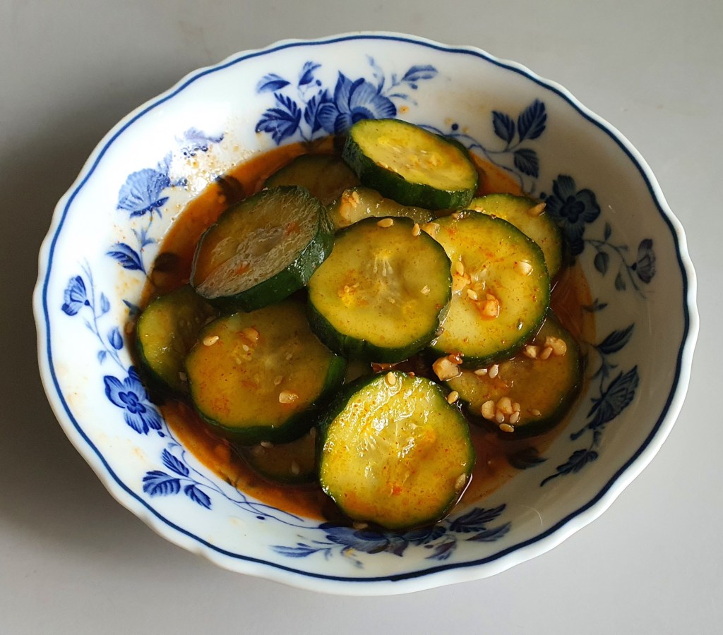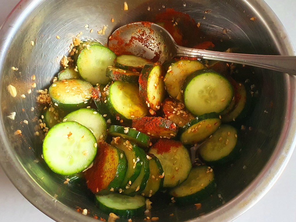 At least one and half tbsp of Apple Vinegar, fish sauce, generous amount of minced garlic, chopped spring onions ,(optional), a tbsp of sesame oil, two tbsp sugar snd 2 tbsp toasted sesame seeds.