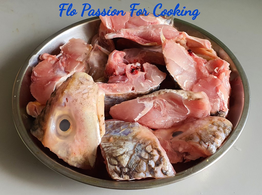 Cut up fish head into chunks.