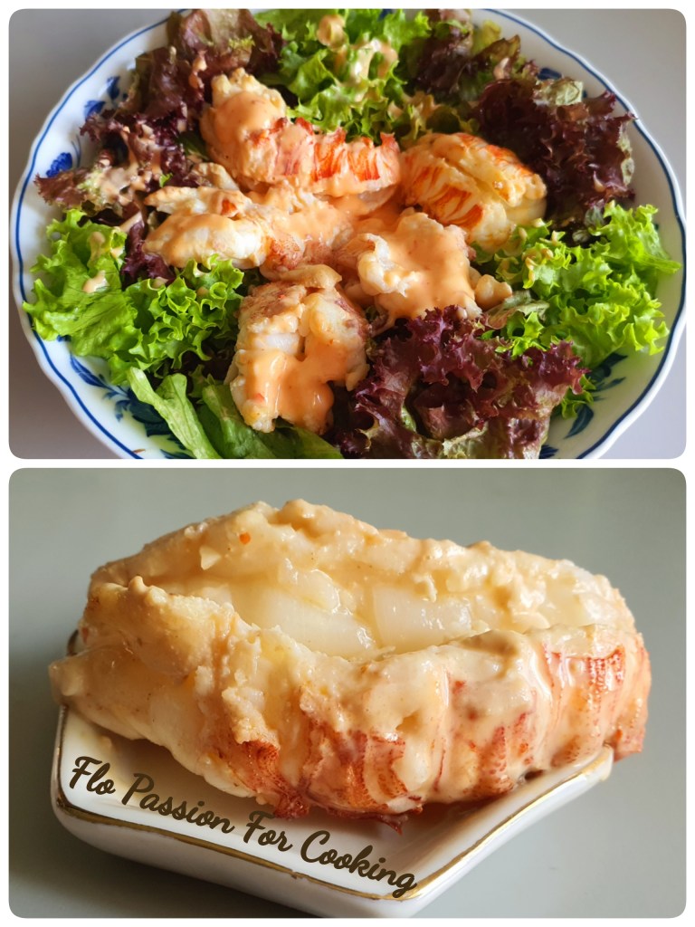 The cooked crayfish with butter and garlic. Served with Green and red Coral Lettuces topped with home made dressing Mentaiko sauce.