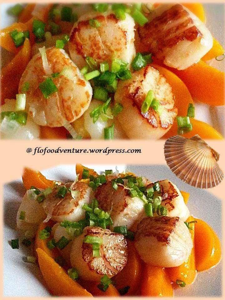 Pan seared scallops served with sliced peaches. 😋