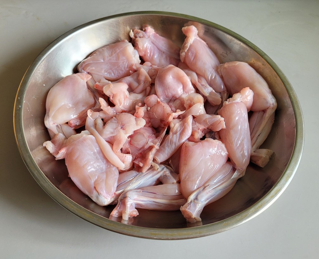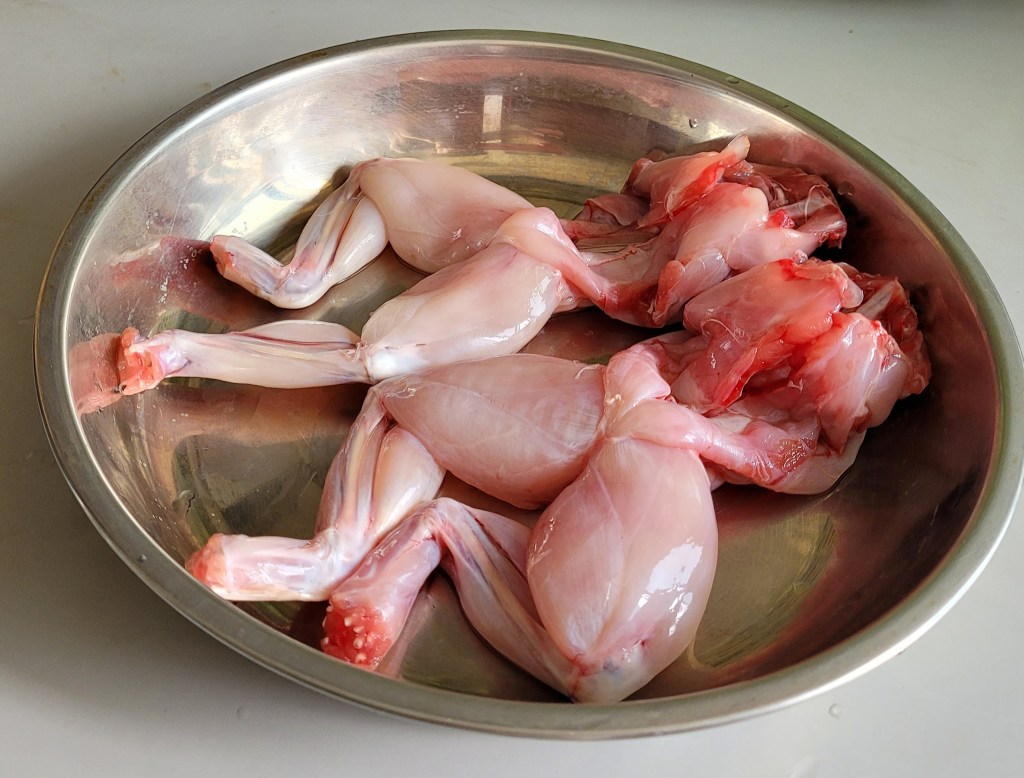 Frog meat is seen as a delicacy and full of protein. Mild flavour with a texture similar to chicken except the taste is between chicken and fish.