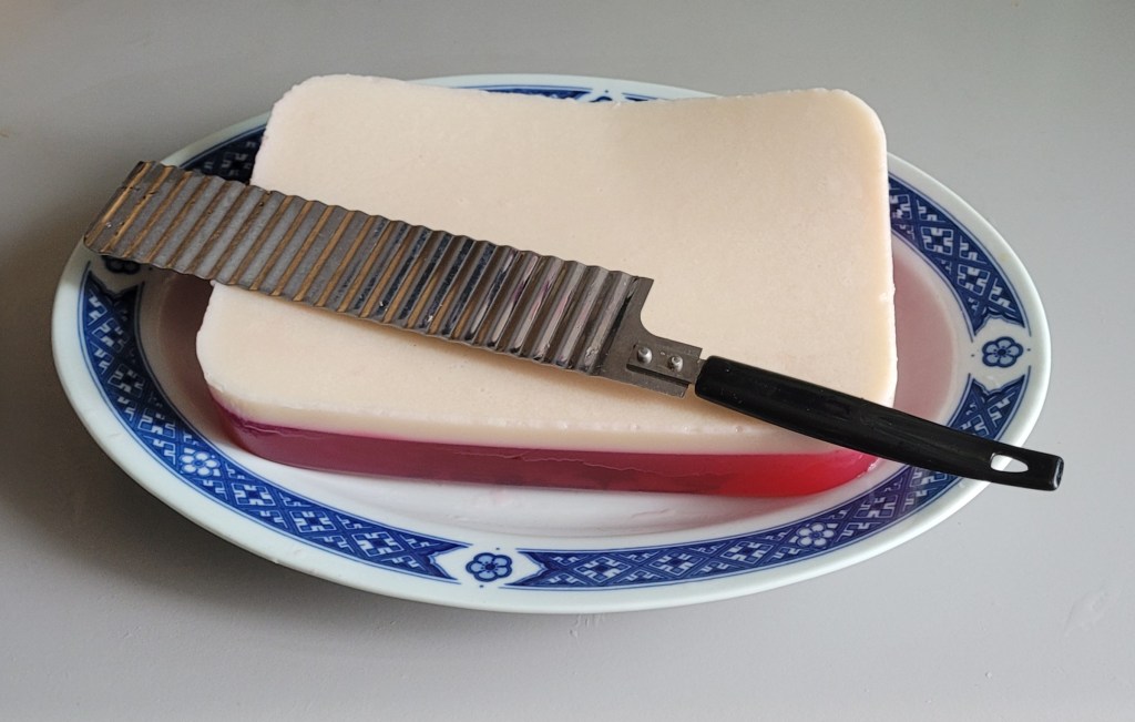 This special wavy agar agar knife is used to cut the dessert before serving.
