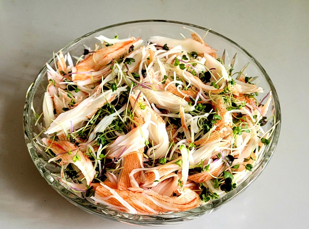 I have added frozen Alaskan king crab legs to these microgreens and look at the lovely combination.