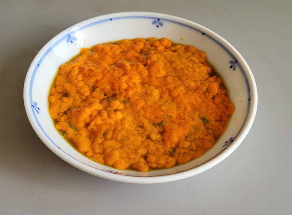 When the rice is almost ready, lightly steamed the crab roe until cooked but not hardened.