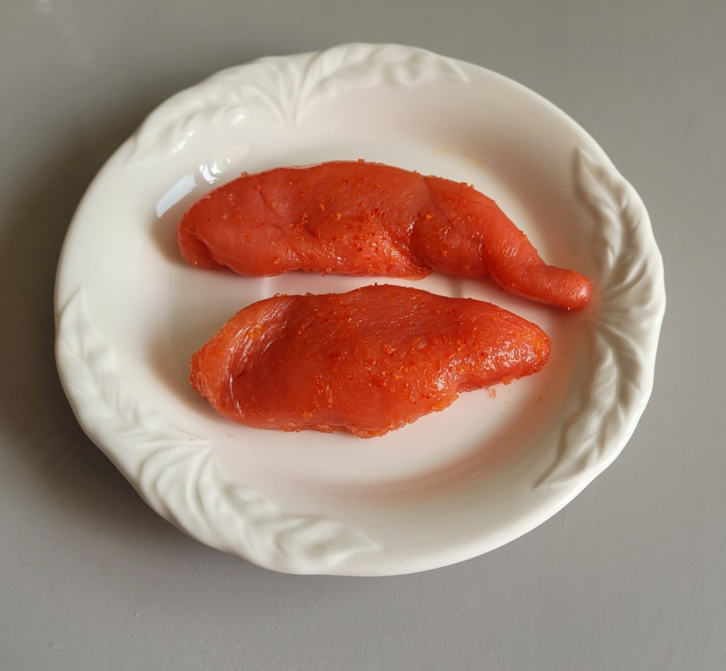 These Mentaiko are whole roe sacs of Alaskan Pollack Cod already cured with salt and marinated in spices.