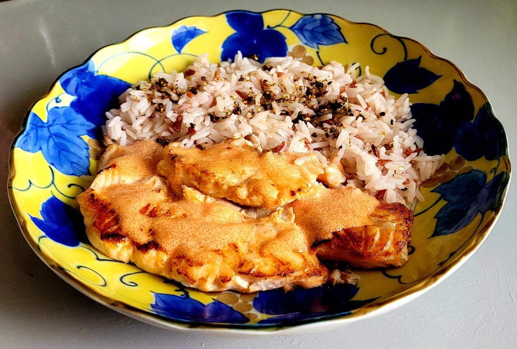 The Salmon steak can be marinated with a dash of mirin before pan frying.