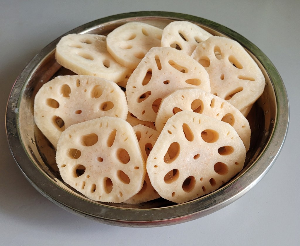To prepare Lotus Roots, peel it with a vegetable peeler and slice lengthwise.